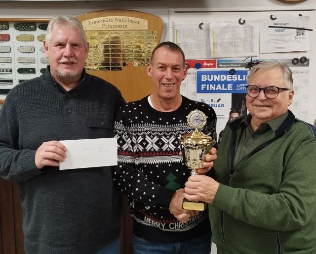 In großer Runde trafen sich die Ü60er zu ihrem Jahresabschluss im Schützenhaus. An diesem Abend gab es lecker Haxe mit Sauerkraut, zubereitet von unserem Kompaniekoch Jörg Cammann. Herzlichen Dank dafür, es war lecker. Die Herren traten auch wieder vor die Scheiben, sollte doch noch der Weihnachtspokal aus geschossen werden und auch das Gutscheinschießen wurde ausgetragen. Die Vorgabe für das Pokalschießen lautete 144 Ring bei 20 Schuss LG Auflage. Eine Ringzahl, die auch für die nicht so geübten Schützen keine so große Herausforderung darstellte. Eine Punktlandung wurde es für Frank Weislowski. Er konnte, den von Gert Lietz gestifteten Pokal, in Empfang nehmen. Beim Gutscheinschießen, es ging um einen Frühstücksgutschein, gespendet vom 4 G-Park, hatte sich Erhard mal etwas anderes ausgedacht. Bei 10 Schuss LG ist es geblieben, aber diesmal waren die Zahlen hinter dem Komma interessant, ein sogenanntes Zehntelschießen. Auch hier die Möglichkeit, für nicht so treffsichere Schützen, als Sieger hervorzugehen. Mit einem deutlichen Vorsprung, in der Summe 6,8 Ring, konnte Carsten Laue das Gutscheinschießen für sich entscheiden.