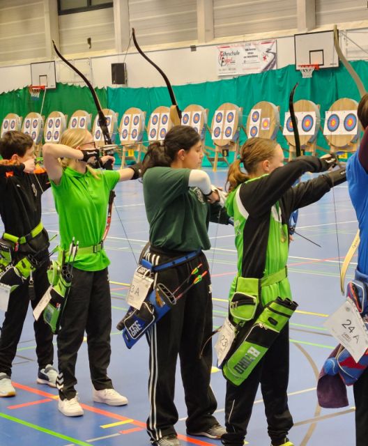 Eine ganz andere Atmosphäre wartete am Samstag auf die Schützen. Eine große Sporthalle mit 30 Bogenscheiben in einer Reihe, einer entsprechend großen Anzahl an Schützen/Schützinnen und einer großen Zuschauerkulisse auf der Tribüne. Bis zu 4 Bogner hatten jeweils eine Bogenscheibe als Ziel, auf das immer abwechselnd geschossen wurde, so dass bis zu 120 Schützen an der Schießlinie standen. Der Wettkampfbeginn war um 15:30 und das Wettkampfende um 19:30 Uhr, mit einer halbstündigen Pause. Ein langer Wettkampftag für die Schüler, aber auch Zeit um neue Freundschaften und Kontakte zu knüpfen. Unsere Schützen erfuhren nicht nur Betreuung durch den Trainer, Normen Nagel, auch die Eltern und auch Großeltern waren zur Unterstützung mitgereist.